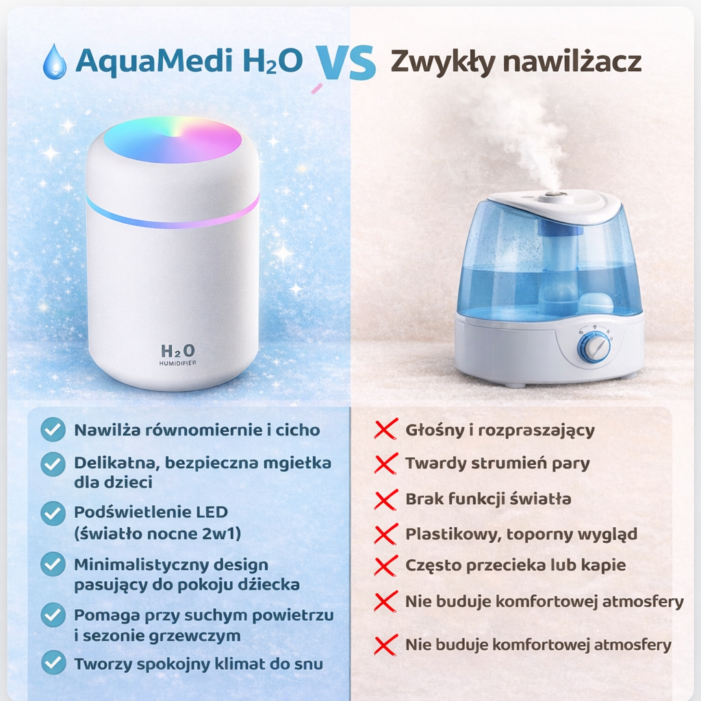 AquaMedi H2O delikatnie nawilża powietrze i pomaga stworzyć komfortowy mikroklimat w pokoju.
