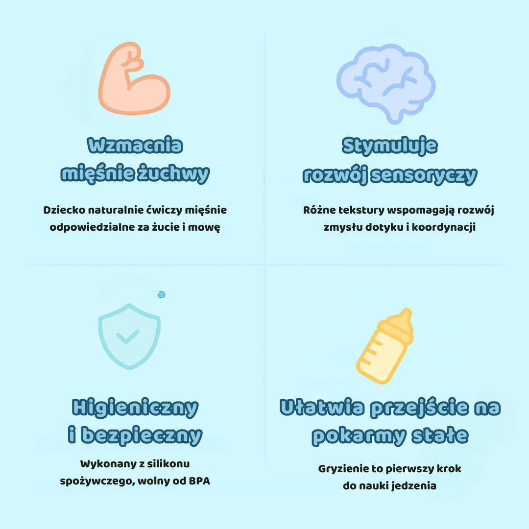 Pomaga wzmacniać mięśnie żuchwy, wspiera prawidłowe kształtowanie zgryzu i łagodnie przygotowuje dziąsła na pojawienie się pierwszych ząbków.